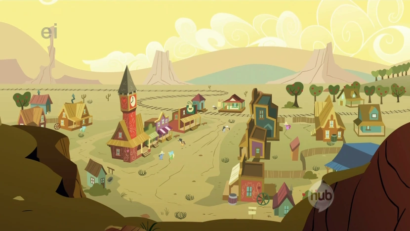 Appleloosa is a frontier town in the Equestrian flatlands. Primarily founded by members of the Apple Family, including Braeburn, Appleloosa's main industry is apple farming, though it's mostly to support the town and its buffalo neighbors. Appleloosa is usually accessed by train, and has few resident pegasi. Currently, Red Gala lives in Appleloosa.
